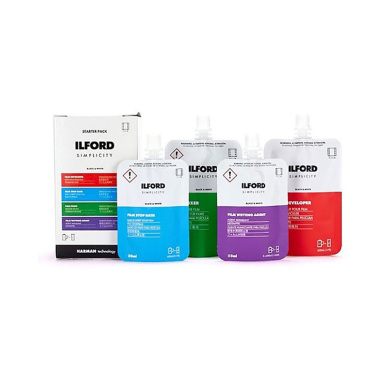 Le kit de démarrage ILFORD SIMPLICITY KIT contient tous les produits chimiques dont vous avez besoin pour commencer à traiter vos propres films noir et blanc. Chaque boîte du kit de démarrage contient: 1 x révélateur de film, 1 x bain d'arrêt de film, 1 x fixateur de film et 1 x agent mouillant de film dans des sachets simples à usage unique.