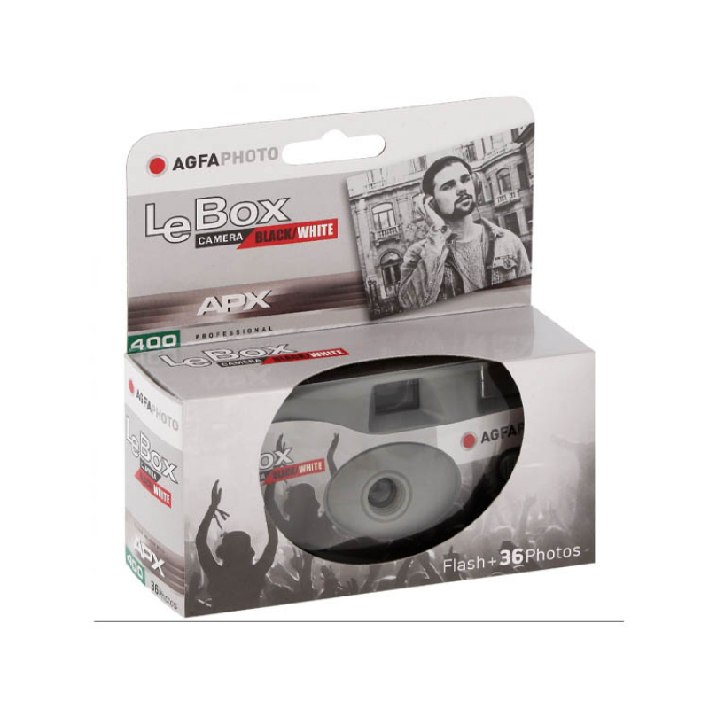 Appareil jetable Agfa Le Box noir et blanc 36 photos avec flash intégré.Il utilise une pellicule Agfa APX 400 ASA Noir&BlancPensez à mettre le flash ;)