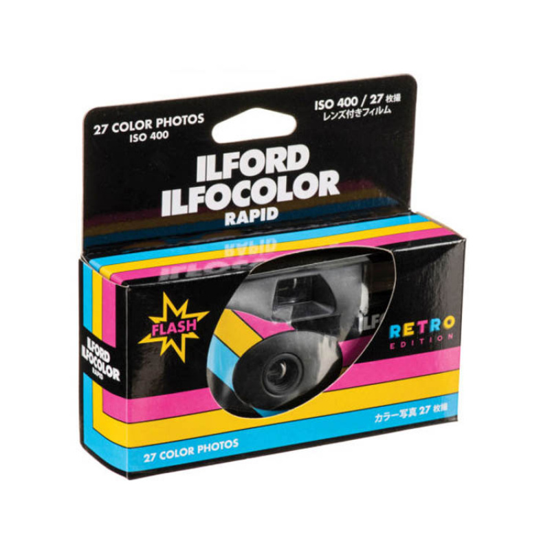 Appareil jetable Ilford 27 photos avec flash intégré.Il utilise une pellicule Kodak 400 ASA. Vous aurez des photos avec un beau contraste et des tons chauds.Pensez à mettre le flash ;)